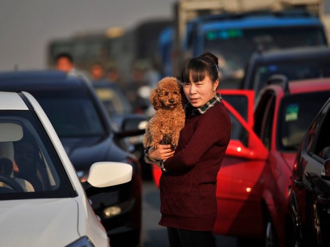 Woman holds her pet dog in the middle of a traffic jam in Anhui province in January 2014.